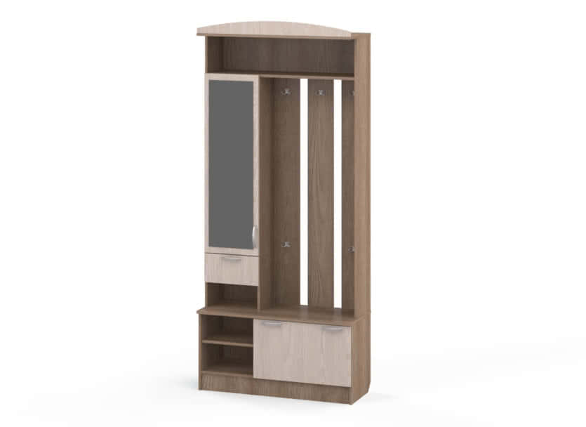Такая конструкция занимает минимальное количество свободного места, нежели изделие, имеющее дверцы. Открытая система намного проще вписывается в окружающее пространство и обладает не громоздким видом. Она может иметь высоту до самого потолка, что способствует рациональному использованию вертикального пространства. Для размещения данной мебели для прихожей, подойдет неглубокая ниша или зона возле входной двери.