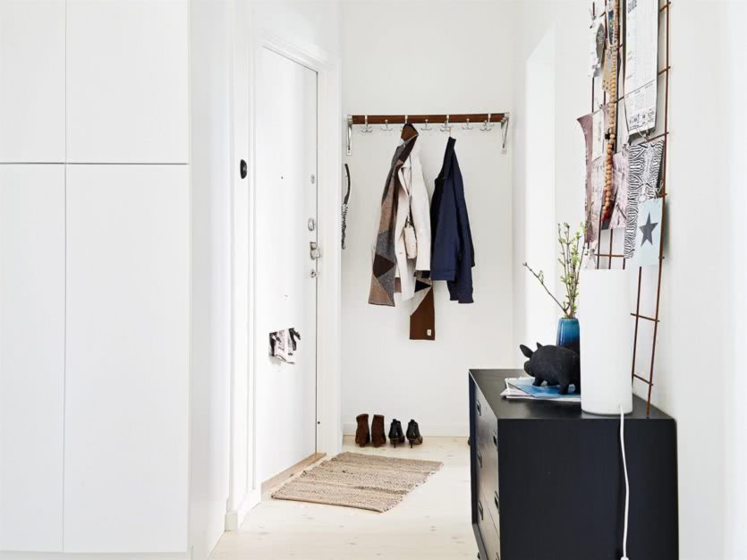 Вешалки прямо у входной двери являются огромным плюсом для каждой прихожей. Особенно, когда у вас нет большой площади на полу, используйте стены как можно больше.
