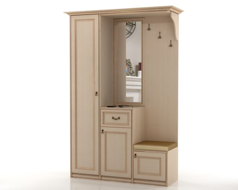 Изящный набор в неоклассическом стиле включает в себя открытую вешалку, обувницу с мягким верхом, антресоли и узкий консольный столик. Напротив крючков располагается зеркало в красивой декоративной раме. Зеркальный шкаф-купе визуально расширяет пространство.