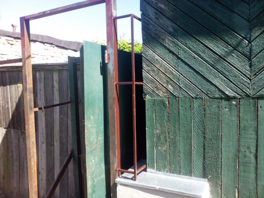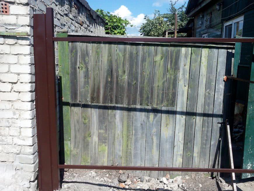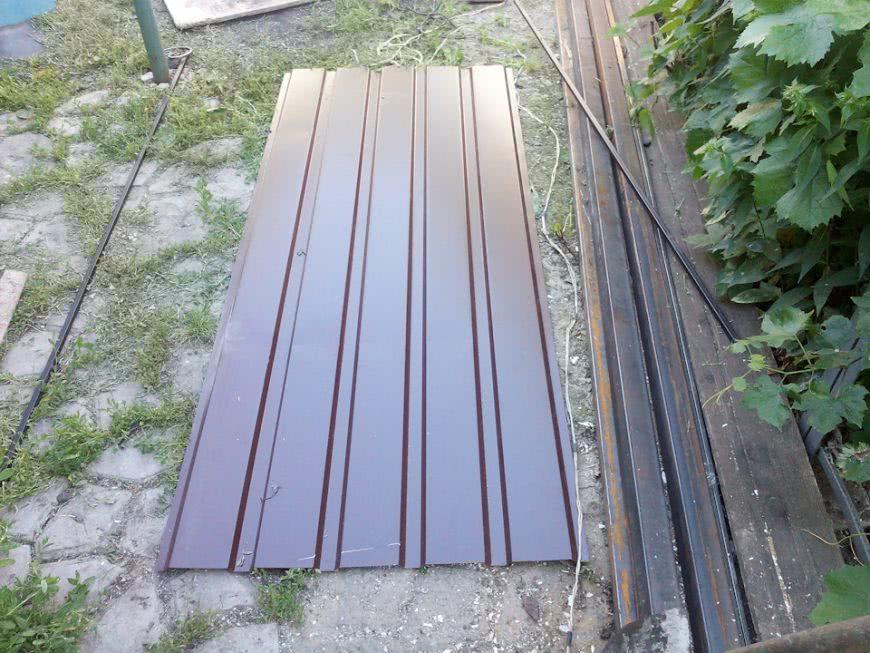 - Отрезается лист профнастила, примеряется к каркасу, проверяется, чтобы калитка хорошо открывалась. Если все хорошо, хорошенько прикручивается на саморезы.