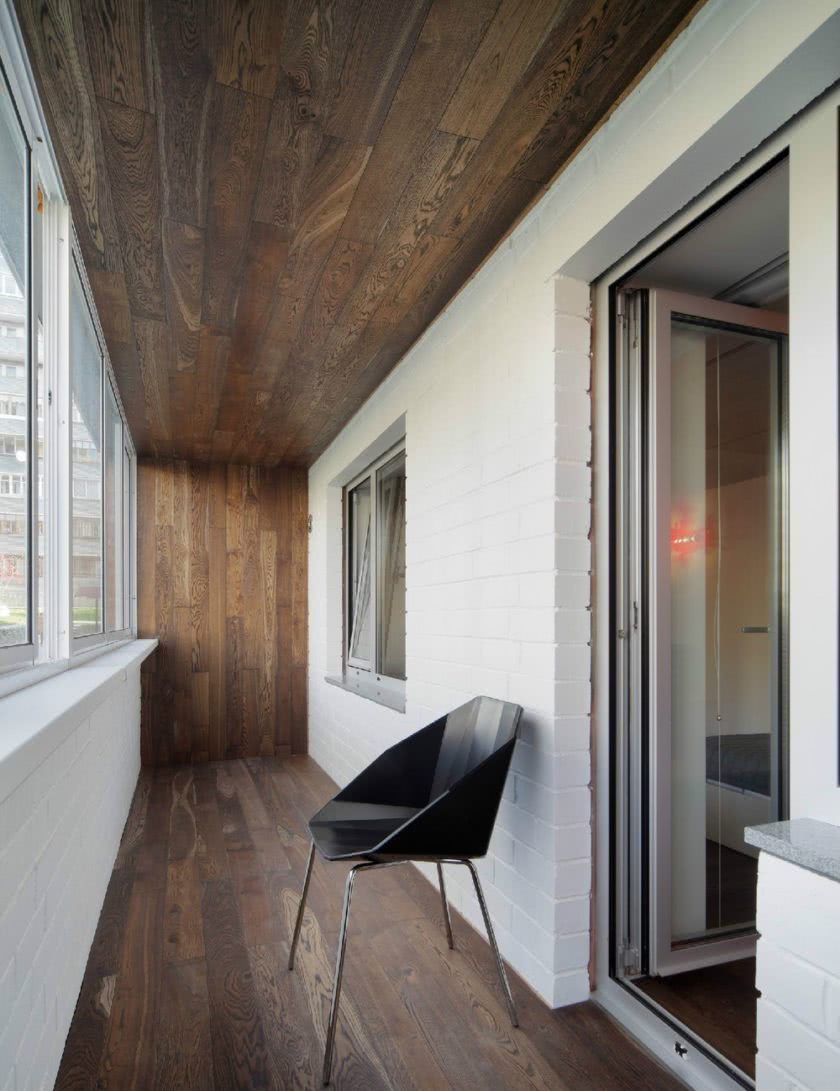 Древесина превращает балкон в подобие комнаты загородного дома, где приятно отдохнуть и расслабиться.