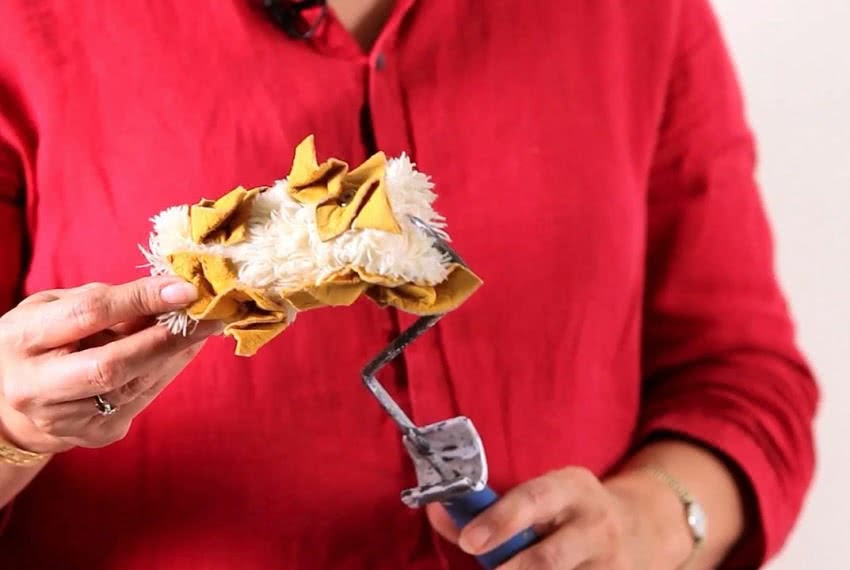 Чтобы модернизировать обыкновенные поролоновые ролики, можно воспользоваться бечевкой или кусочками поролона, расположив их по диагонали или в любом другом направлении. Такой метод поможет создать естественный рисунок, например, повторяющий структуру коры дерева. Для создания орнамента «морозного утра» следует воспользоваться какой-либо фактурной скомканной тканью (хлопок, лен). Валик обматывается выбранным материалом и далее такой текстурный инструмент применяют в работе по декорированию поверхности.
