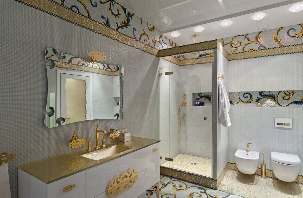 Если санузел не совмещенный, то дизайн для ванны с мозаикой, рекомендуется разбивать на зоны, подбирая панно. Мозаикой ванную комнату можно выложить разноцветными волнами. Мозаика благодарный материал и облицевать ею можно поверхность любой формы — круглой, овальной, что практично для помещения, где стены не отличаются абсолютной ровностью.