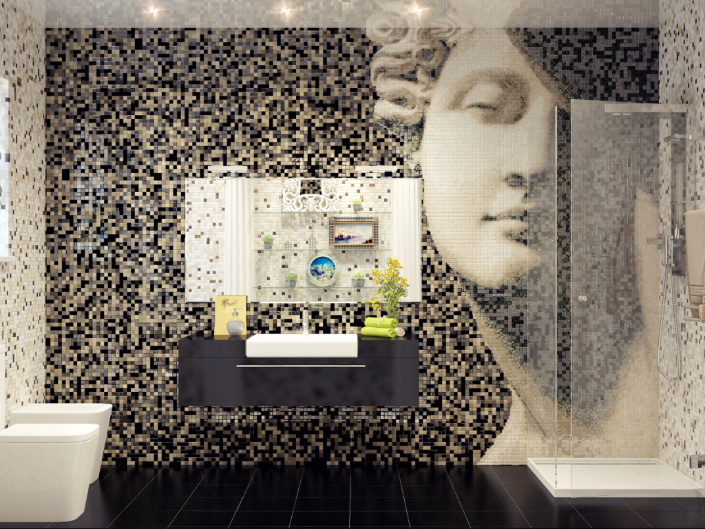 Даже в маленькой квартире при помощи мозаики можно воплотить самые смелые творческие идеи. Ванную можно декорировать всевозможными орнаментами, геометрическими узорами и картинами.