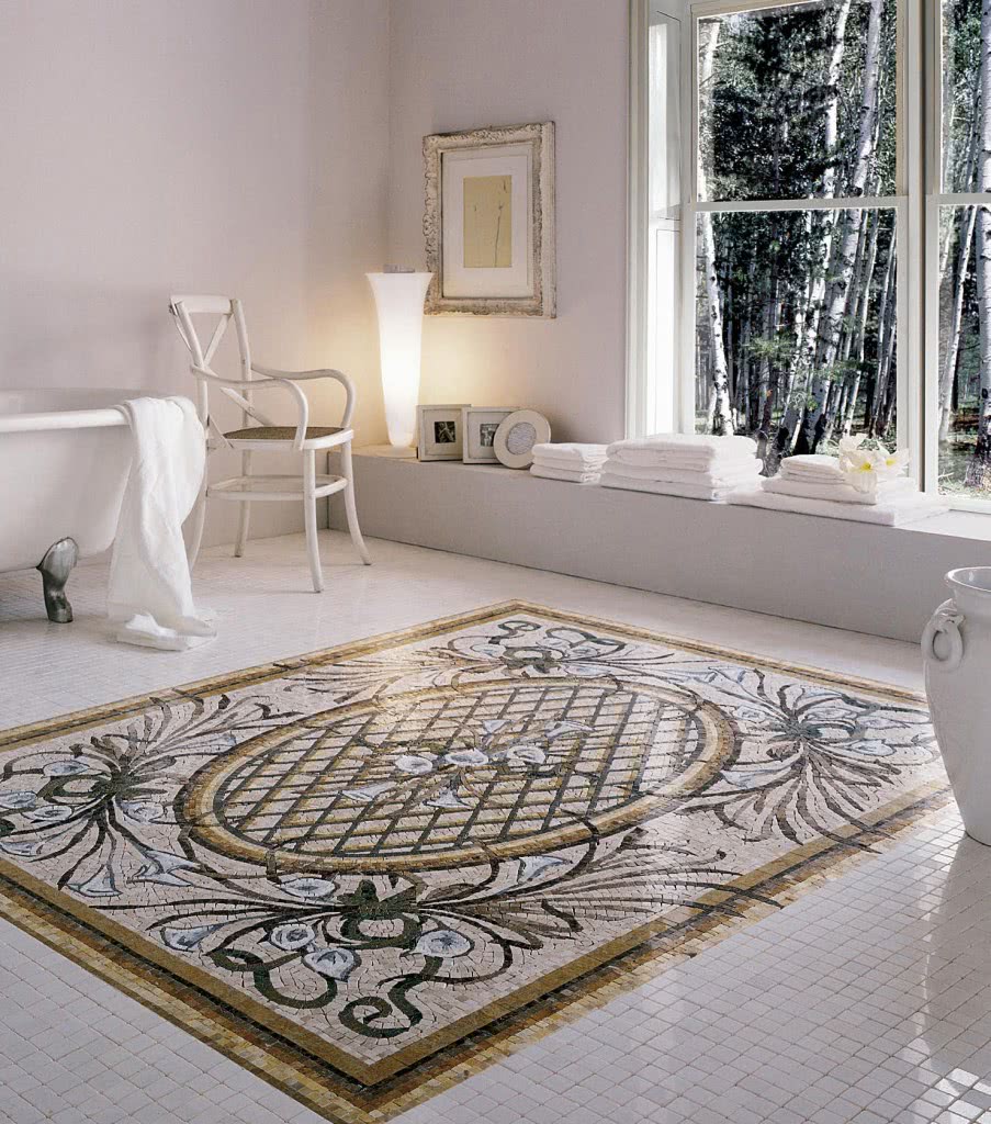 - Флорентийская — распилы различных камней с отшлифовкой поверхности. Может использоваться и в различных современных интерьерах, сочетаясь с однотонной сантехникой и декором.