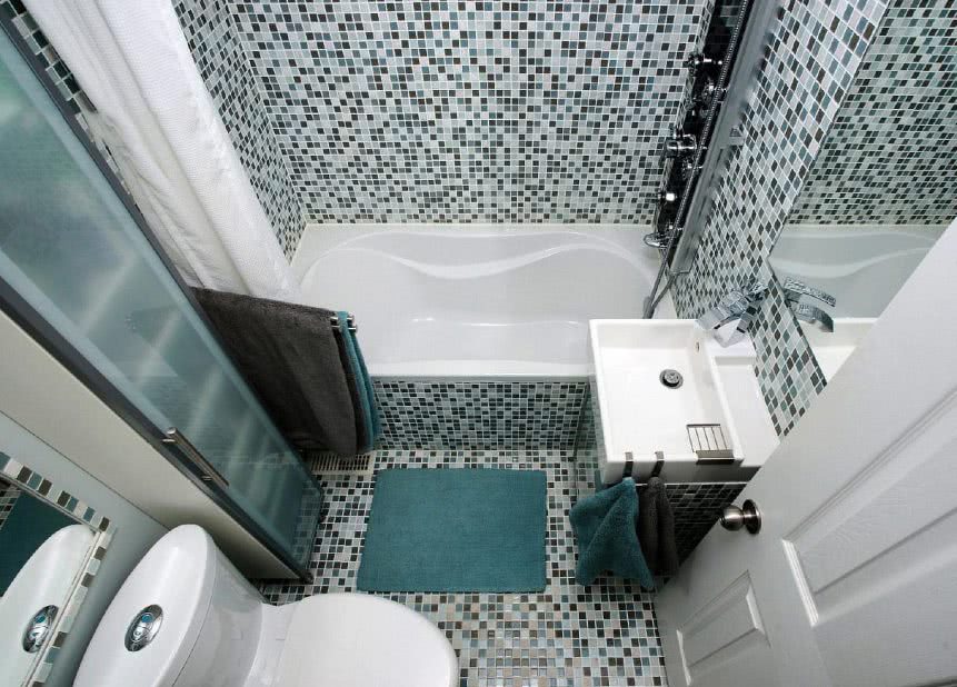 Колер мозаики должен немного сузить ванную, сделав интерьер комфортабельнее.