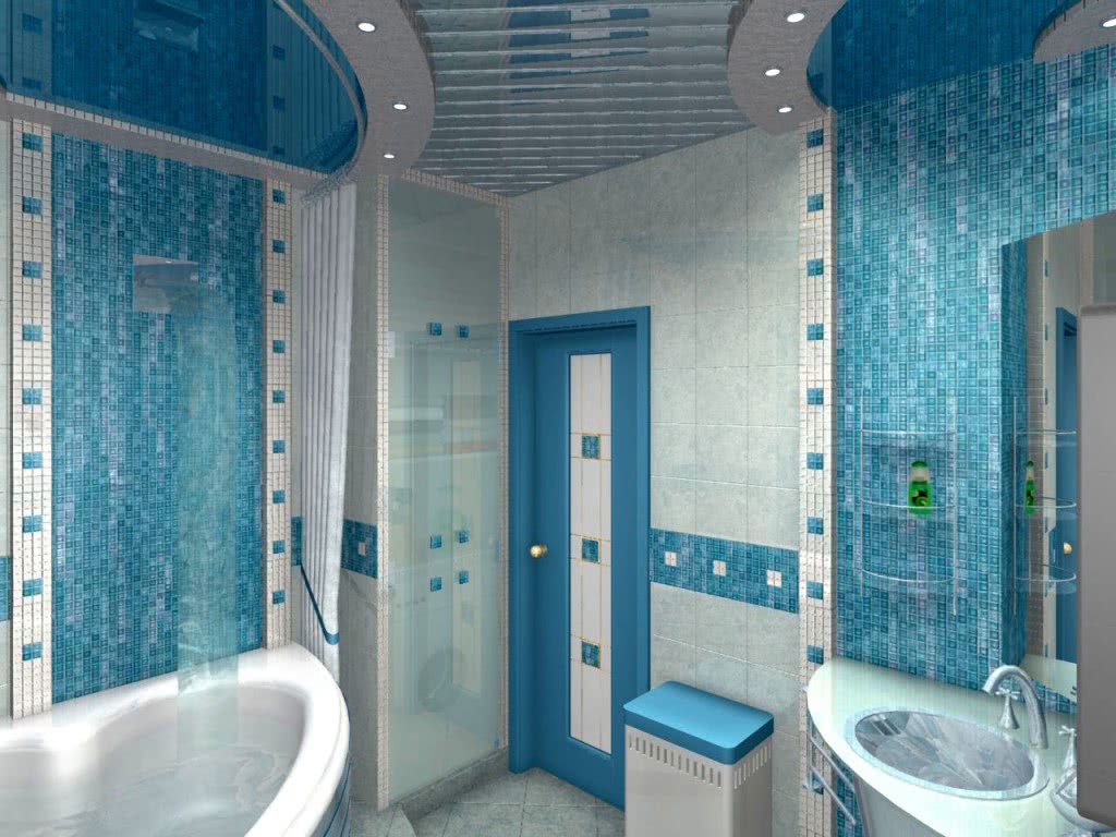 Морская гамма цветов с однотонной плиткой и подвесным глянцевым потолком, сочетается лучше всего. Мелкую мозаику в интерьере ванной лучше класть на стенах, на полу и ступеньках. Рекомендуемый дизайн эффектно смотрится с аналогичными цветовыми решениями при установке диодного или неонового освещения.