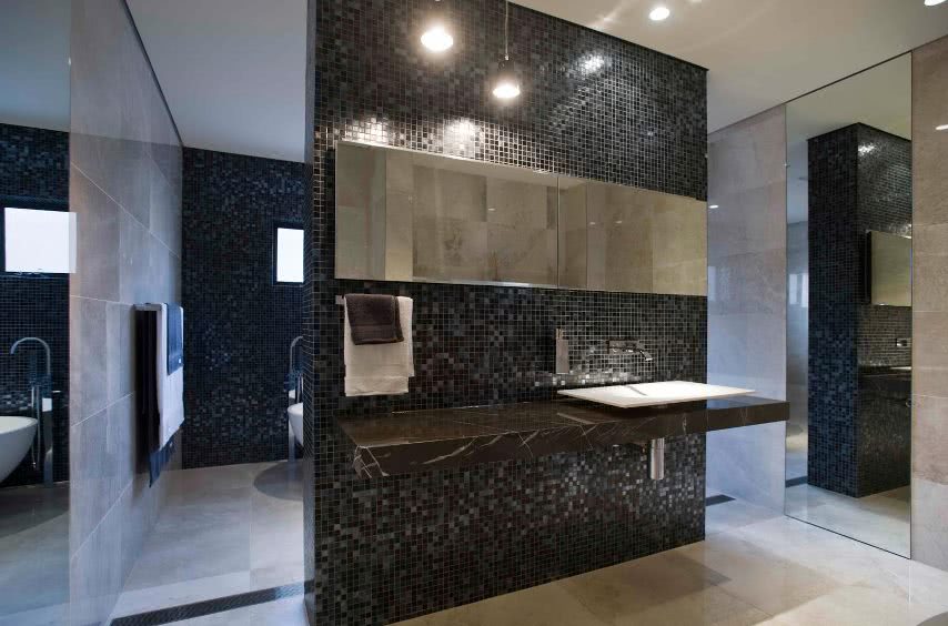 Используя мозаичную плитку, поделите просторную комнату на зоны с разным функционалом: в одной будет раковина, в другой — душевая, а в третьей – туалет. Наклеить при оформлении лучше блестящее покрытие.
