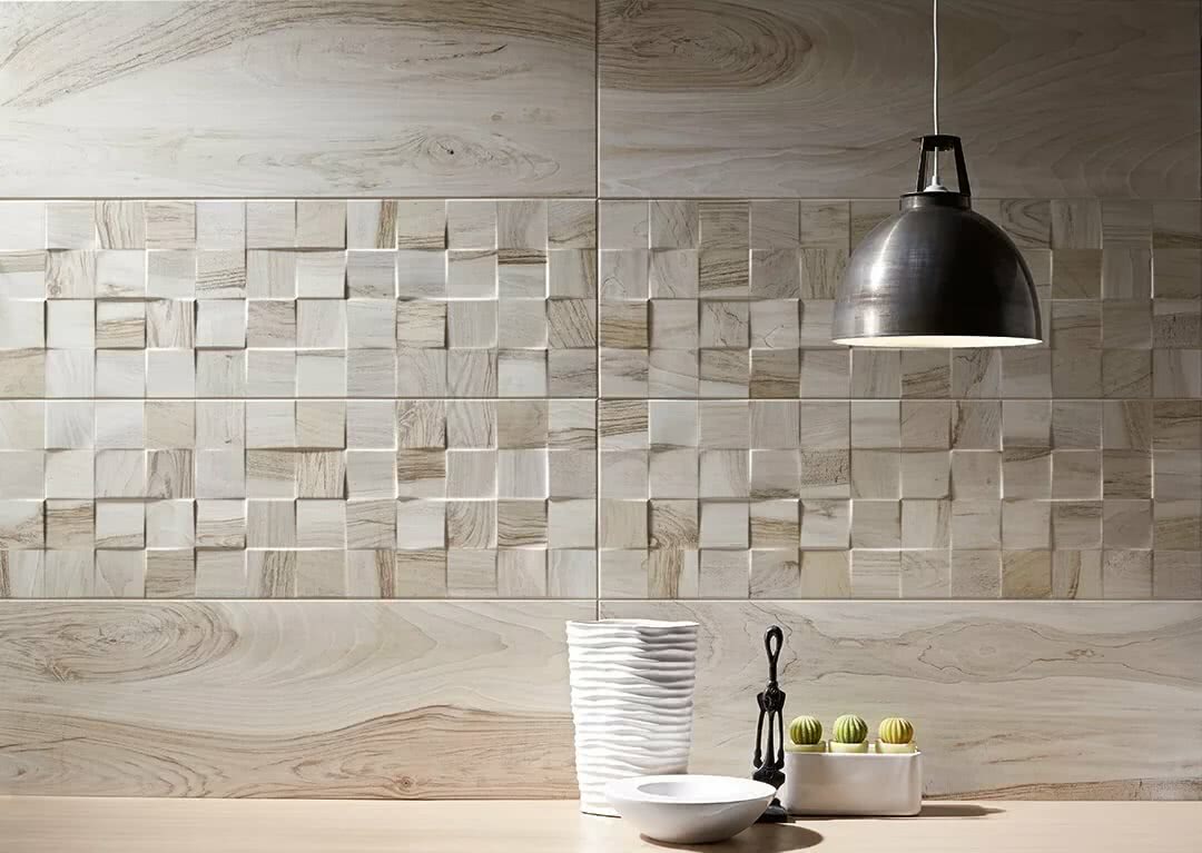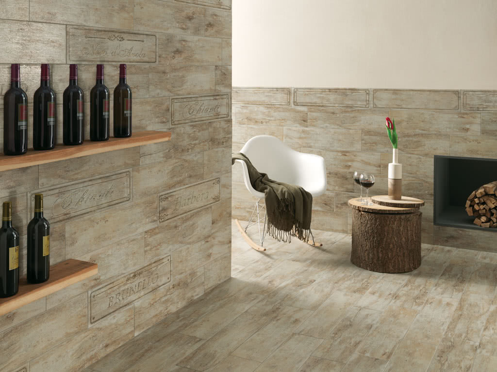Светлая плитка под дерево из керамогранита отлично смотрится на стенах.