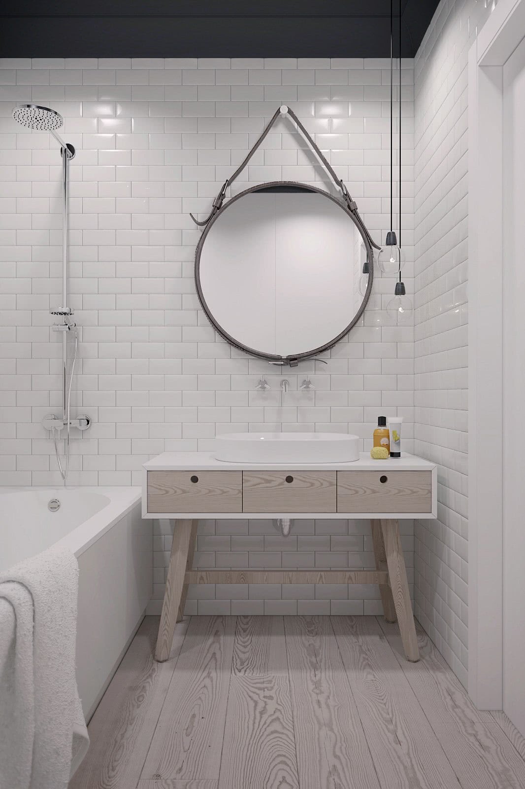 Основополагающий цвет сканди — белый. Он делает помещение светлым и воздушным. Визуальный контраст обеспечивают темные плафоны светильников, смесители и древесные оттенки столешницы, полочек и шкафов. Часто для швов между плиткой используют темную затирку. Это немного сглаживает визуальную стерильность стен и облегчает поддержание их чистоты.