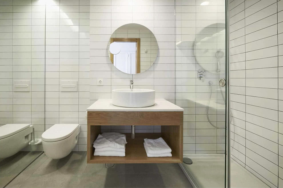Поверхности в ванной часто соприкасаются с водой, а также попадают под воздействие высоких температур. В связи с этим отделочные материалы подбираются с учетом их характеристик и только после — визуальных качеств.
