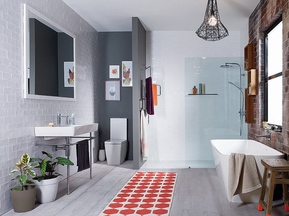 С помощью кирпича в скандинавскую ванную комнату можно добавить нотку индустриального стиля. Это отличная альтернатива традиционной кафельной плитке. Разноцветные кирпичи здесь создают элемент причудливости и расширяют цветовую палитру. Затем эти теплые коричневые и серые оттенки могут быть повторены на стенах и в узорчатой напольной плитке.