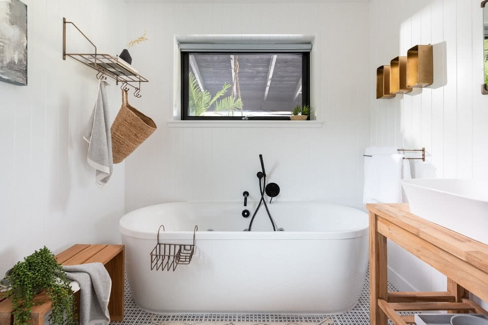 Ванная выполнена в нестандартном элегантном скандии стиле – натуральные материалы, гладкие поверхностиИсточник thearchitect.pro