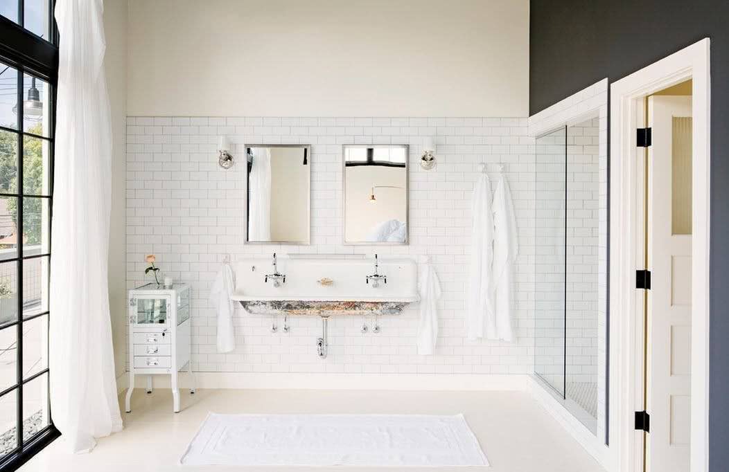 Необычный подход к устройству искусственного освещения в ванной комнате, отделанной в стилистике лофт-дизайна, которое дополняет естественный свет, идущий от большого окна