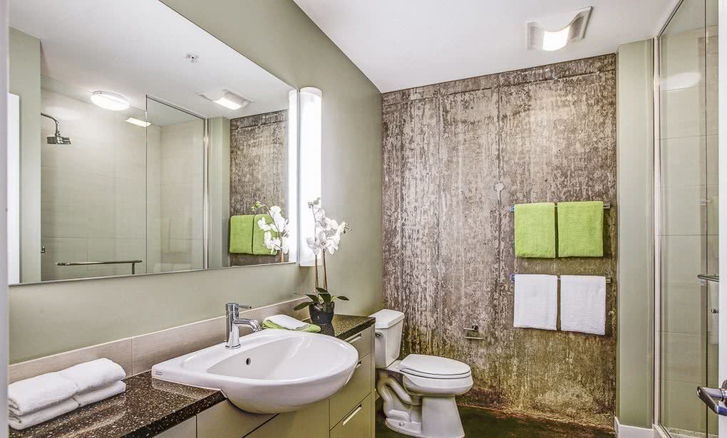 Стены, выполненные из бетона, не являются обязательными в урбанистическом направлении. К тому же цементную стяжку чаще всего оформляют в виде акцента. Это может быть небольшой участок стены, который рекомендуется располагать подальше от сантехники. В больших и просторных помещениях бетоном есть возможность покрыть большую часть площади. Особенно стильно смотрятся бетонные стены в сочетании с керамической плиткой с имитацией под дерево и деревянными полками.