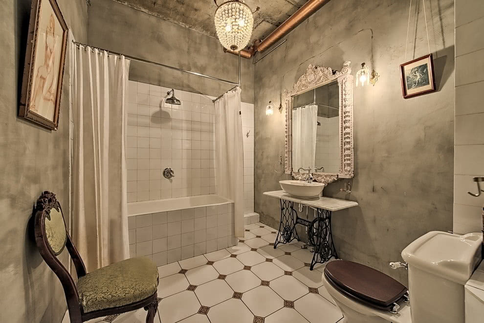 Изюминкой в отделке интерьера в стиле лофт могут стать необычные бра или плафоны. Они придадут помещению особого шарма, а зеркала высотой от пола до потолка с отражающимися в них лампами зрительно расширят габариты ванной комнаты.