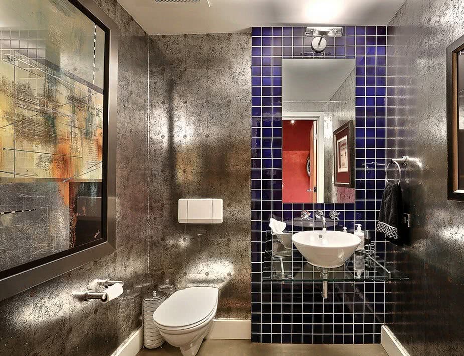 Как вариант, можно использовать оцинкованный лист для стены или установить раковину из стали. Зеркальный серый будет отражать свет и зрительно расширять помещение.