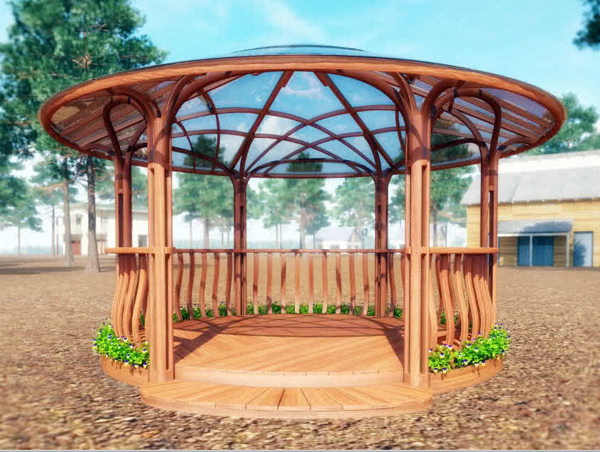 У традиционной беседки всегда есть основание, представляющее собой платформу, которая расширяется вокруг нее, иногда образуя своего рода небольшую палубу, которая обрамляет беседку и имитирует ее форму или форму крыши.