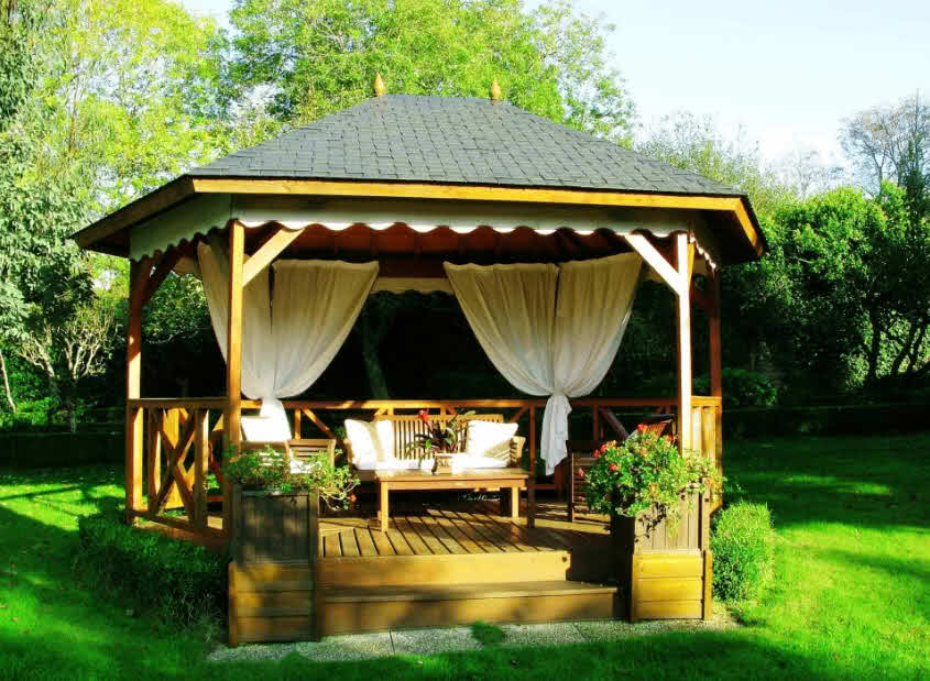 беседка в виде навеса. Самый простой способ организации места для отдыха и веселья заключается в элементарном перекрытии прилегающей к дому площади и установкой необходимой мебели. Помимо твердого перекрытия, можно использовать временный тканный материал, соорудив что-то наподобие шатра и почувствовав себя турецким султаном. В данном случае форма может быть довольно разнообразной от стандартной до причудливой;