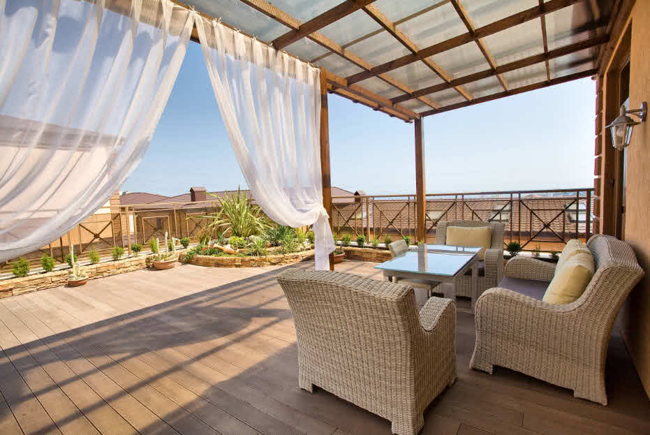 - двухэтажная террасная конструкция — на ее крыше можно принимать солнечные ванны;
