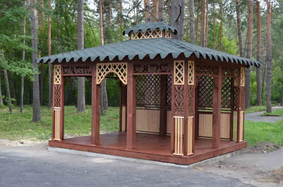 - беседка в русском стиле — украшена резными деревянными элементами;