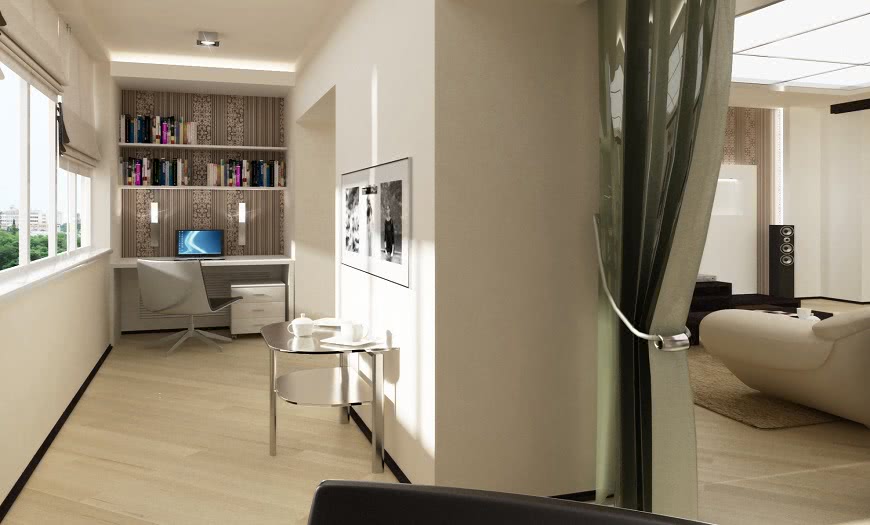 При отделении балконной зоны есть два варианта действий. Если частично снести блок, окно останется на месте, а дверь будет открытой. Такую конструкцию можно вписать в декор разными способами. Если убрать и дверь, и окно, останется элемент стены, который будет выполнять роль столика или стойки. В данном случае имеется более широкий выбор интерьера.