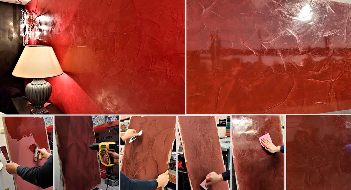 После того, как вся плоскость станет ровной, переходят к процессу глянцевания венецианской штукатурки. Для этого снова используется кельма или терка. Движения – сильные и уверенные, угол инструмента по отношению к стене тот же, что при разгоне. Работа проводится до появления глянца, после чего принимаются за следующий участок, где вся процедура от нанесения до глянцевания повторяется.