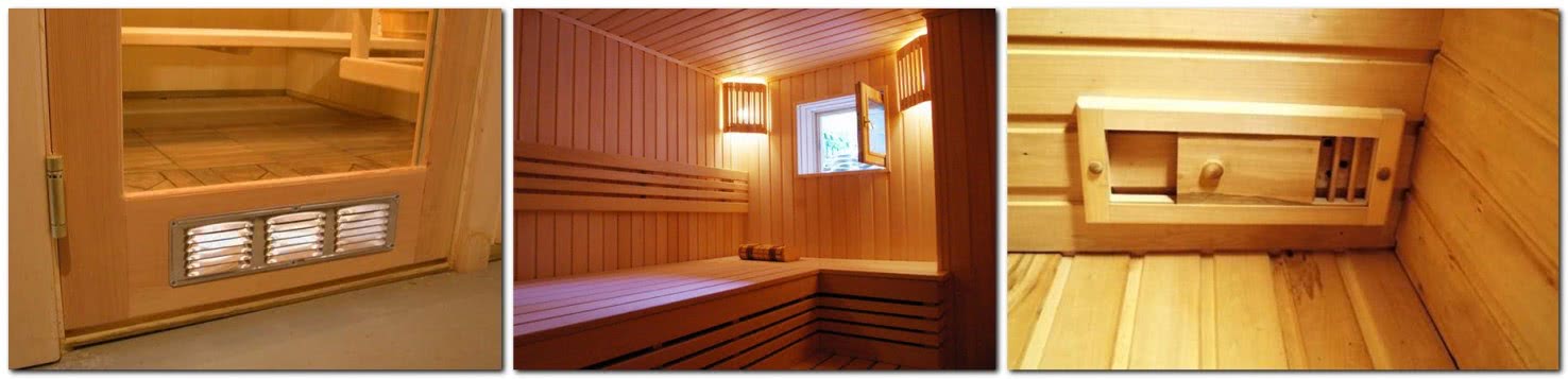 Но в ней необходимо поддерживать комфортную для приема процедур температуру, причем так, чтобы не образовывались сквозняки, и не было резкого перепада от жары на полке до холода на полу. Для этого воздушные потоки должны двигаться по определенной траектории, которую задают посредством размещения приточных и вытяжных отверстий в конкретных местах.
