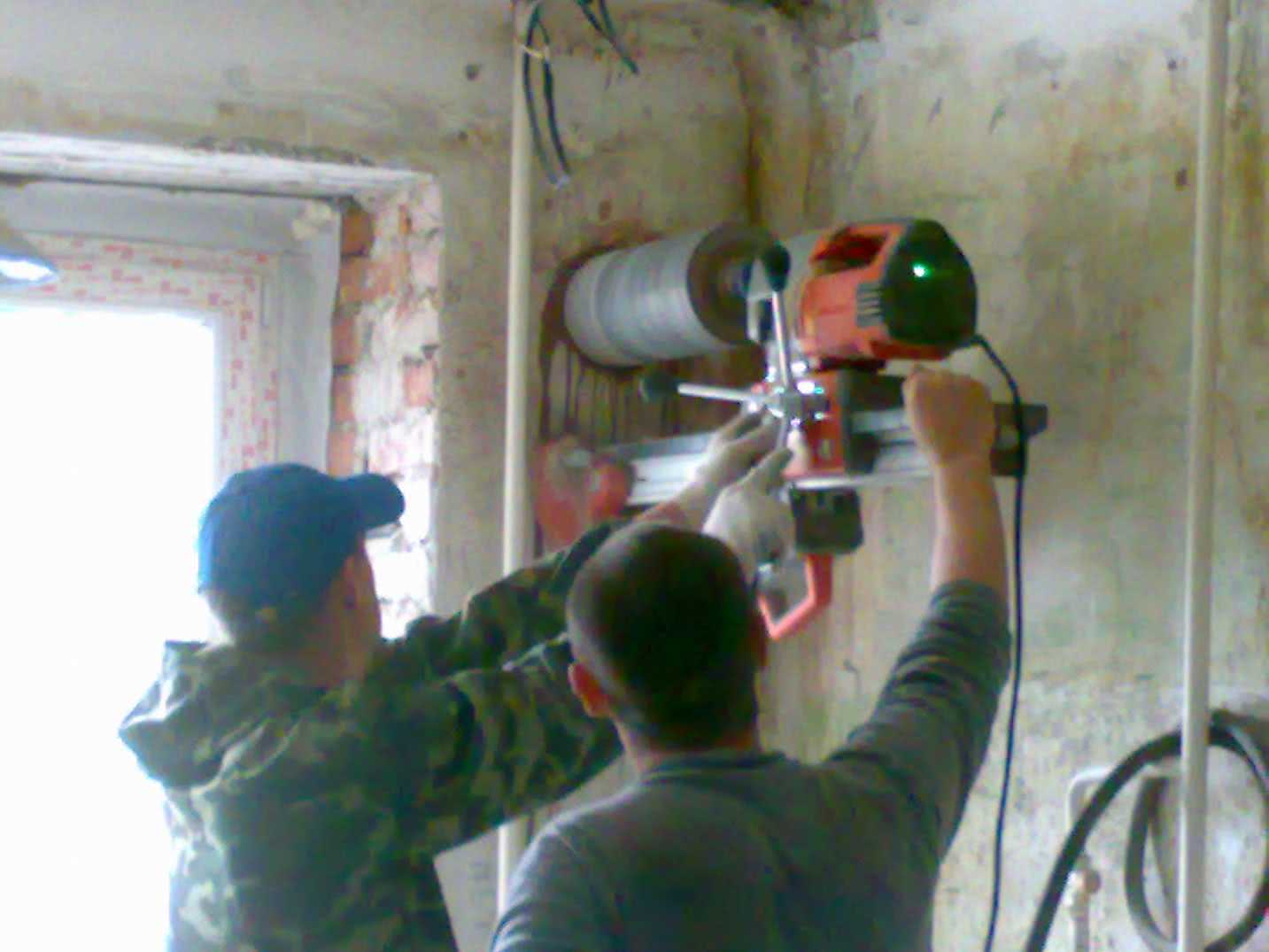 - надо также перфоратором и коронкой сделать сквозное отверстие;