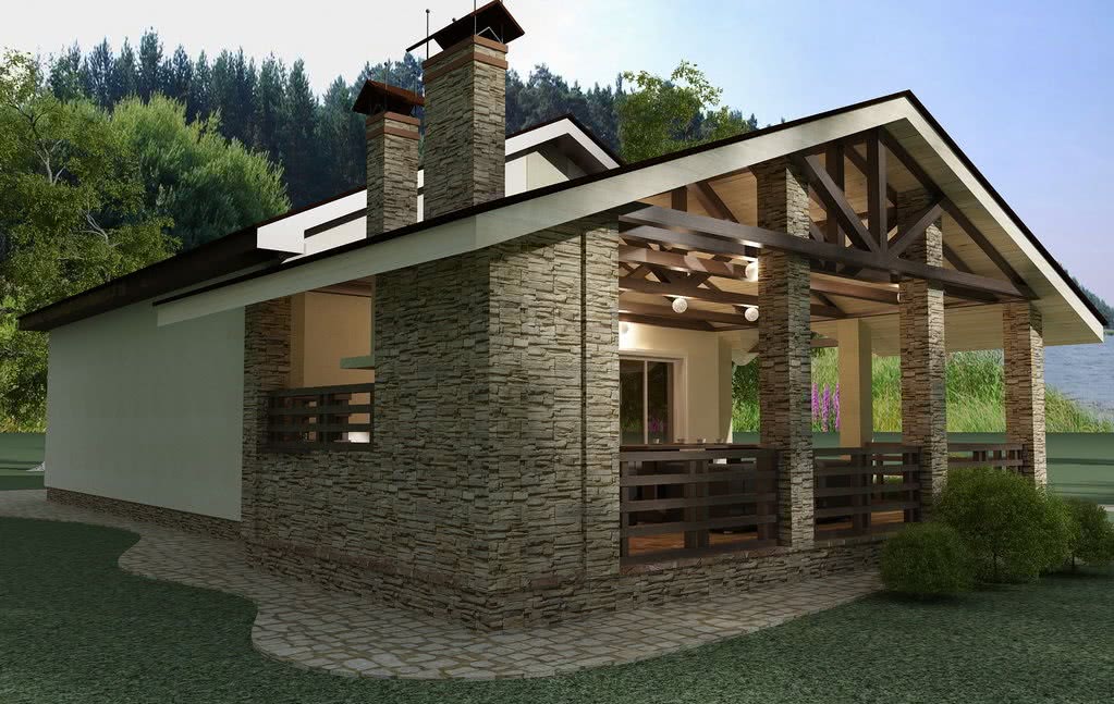 Веранда может быть как частью бани, так и отдельным строением. Когда конструкция строится отдельно, то с баней ее соединяют крытым коридором. Длинную или угловую модель можно разделить на две зоны: кухню и комнату отдыха. Традиционно, для длинной модели выбирается самая большая стена бани, но это не является обязательным условием. В конструкции может быть несколько выходов: основной и в сад или к бассейну.