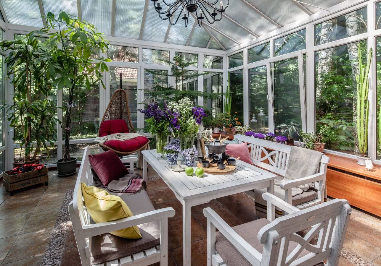 Остекленные крыша и стены закрытой веранды – замечательный вариант дизайна. Границы помещения такой приём визуально расширит. Эту самую светлую комнату можно будет превратить в помещение определённых увлечений, встреч.