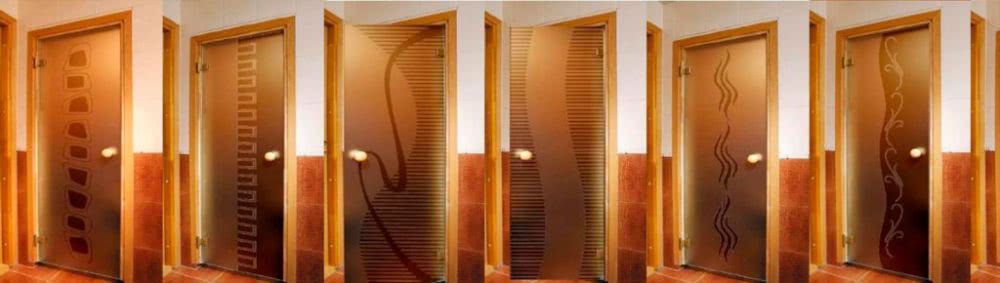 Стекло декорируют разными способами: матируют, обжигают, гравируют, украшают рисунками или фотоизображениями. Популярностью пользуется и окрашивание полотен в разные цвета: синий, зеленый, бирюзовый и т.д. Заказать декоративное оформление банной двери из стекла можно у компаний производителей или в специальных дизайнерских фирмах.