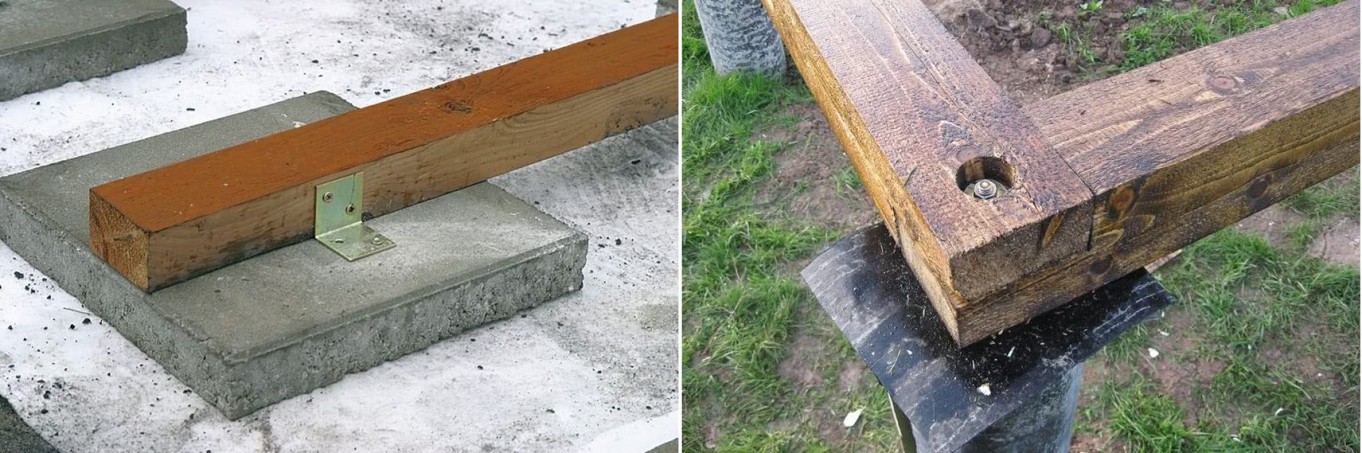 - В отмеченных местах вырубите в брусьях пазы, установите опорный брус и закрепите их к основе металлическими уголками