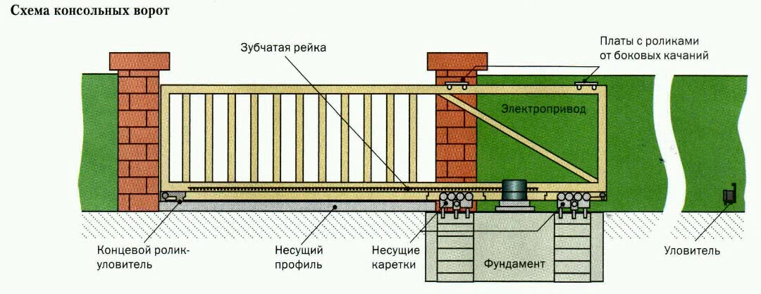 Конструкцию откатных ворот выбирают в зависимости от особенностей участка и расположения на нем построек. Необходимо учитывать и характеристики грунта, находящегося в зоне установки ворот.