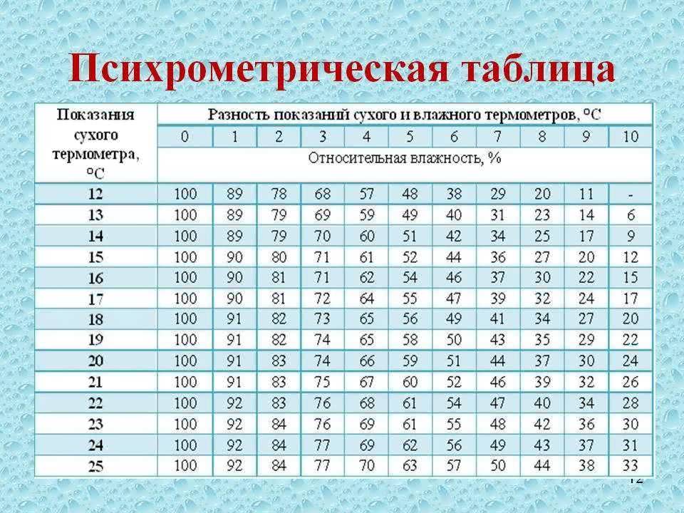 Таблица влажности воздуха используется при измерении содержания влаги с помощью «сухого» и «мокрого» термометров. Разница температур соответствует значению относительной влажности.