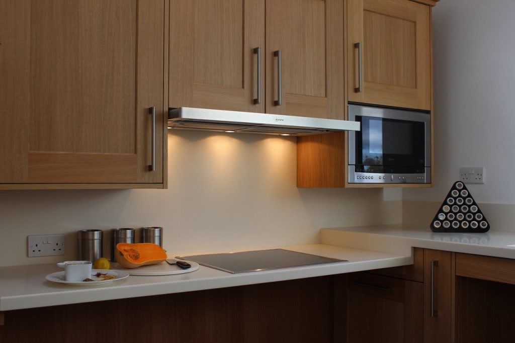 Встраиваемая техника крепиться внутри кухонного шкафа. Такая форма корпуса позволяет спрятать всю конструкцию вытяжки, оставляя «на глазах» только привлекательную лицевую панель с органами управления. Прекрасный вариант для тех, кто «лишней конструкцией» не хочет портить интерьер помещения.