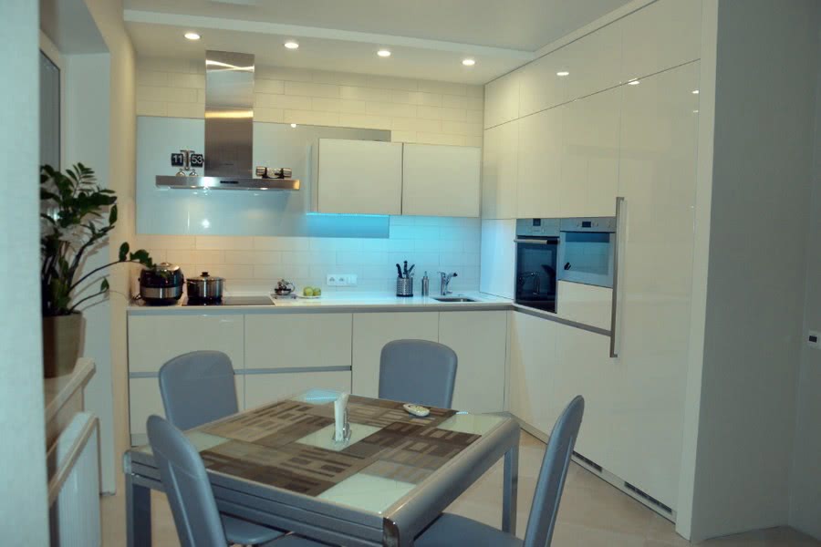 Данный способ подходит для ситуации, когда ремонт на кухне уже завершен. Скрытый монтаж вентиляционной системы получится выполнить с помощью декоративного короба из пластика. Такие изделия продаются во множестве вариантов расцветок. Существуют даже специальные коробы, в которых встроены точечные светильники. Их использование будет особенно полезно в том случае, когда для плиты требуется дополнительно освещение.
