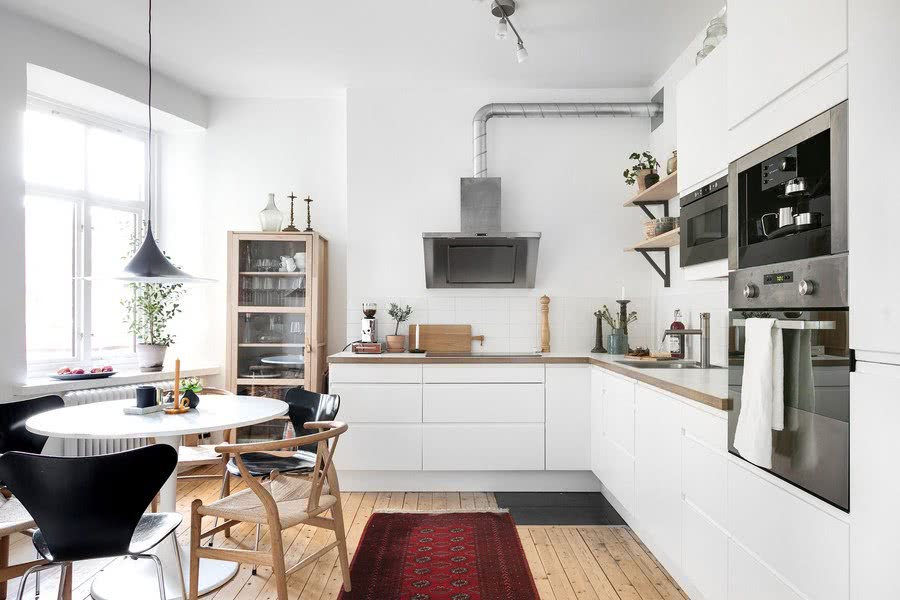 Стоит отдать предпочтение цилиндрическим вытяжкам. Вместе с закругленными углами столешницы (это как вариант) они создадут на небольшой островной кухне прекрасную композицию и удобное рабочее пространство. Подобные вытяжки белого цвета или другого светлого оттенка способны визуально увеличивать высоту помещения.
