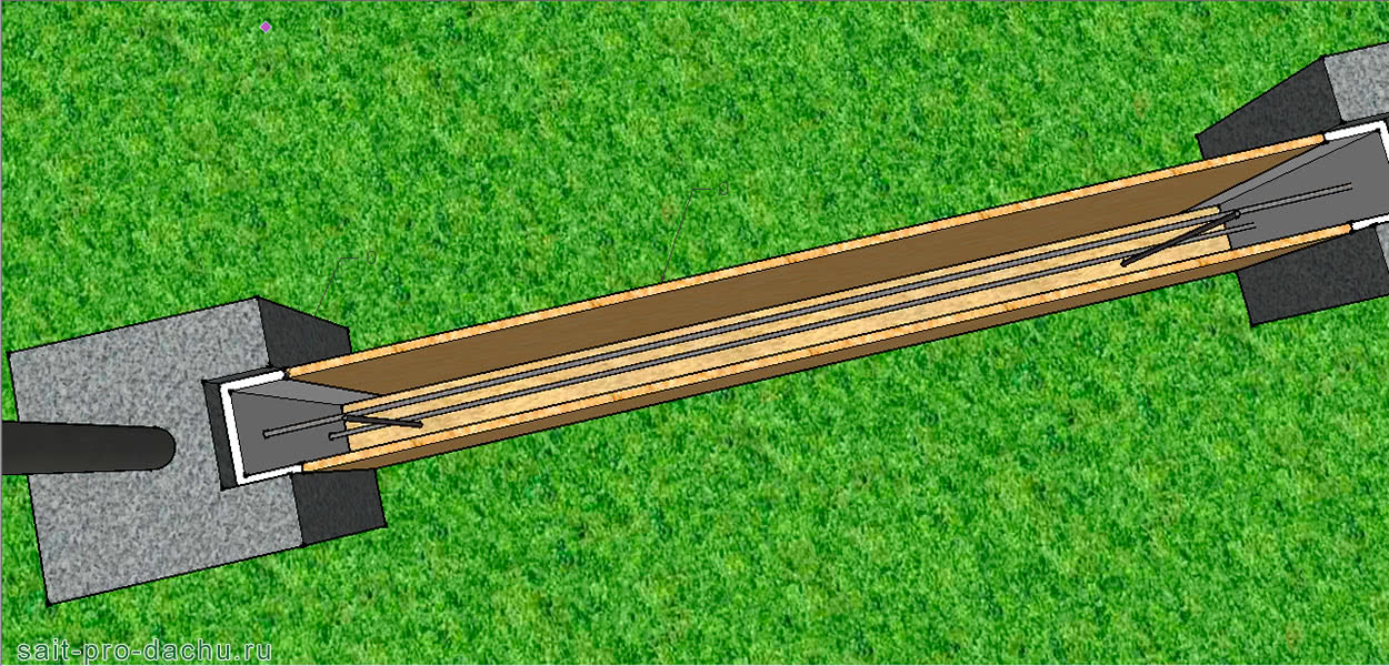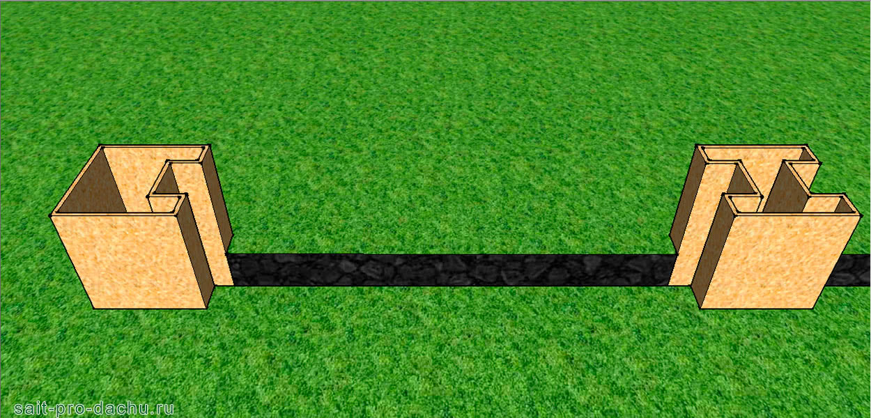 - В каждой из них со стороны прорытых под цоколь траншей, опалубкой нужно предусмотреть небольшой паз в 140 мм шириной и глубиной 70-100 мм. Как это выглядит, можно увидеть на следующем фото.