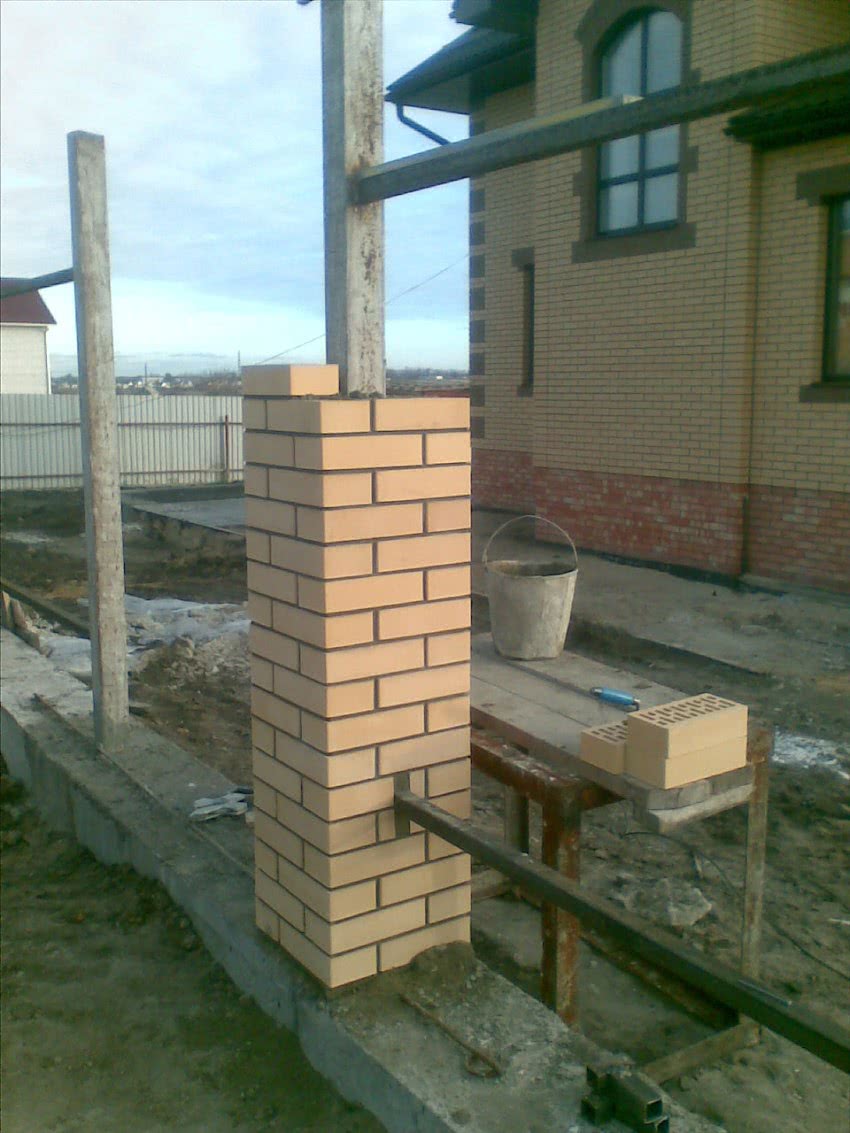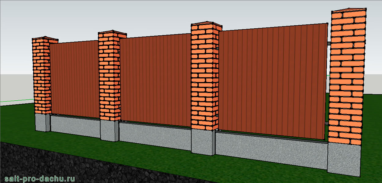 Профнастил обладает большой парусностью. Поэтому листы должны крепиться на вертикальные столбы. Данные элементы ограждения выполняются из разных материалов. Забор из профнастила с кирпичными столбами относится к элитным сооружениям, имеет респектабельный внешний вид. Для такого забора необходим железобетонный ленточный фундамент.