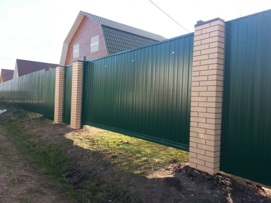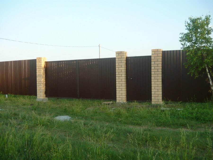 Если разговор о выполнении работы собственными силами, то лучше выбрать более простой вариант. Например, забор из профнастила со столбами из труб. Здесь присутствует простой монтаж и невысокая цена.