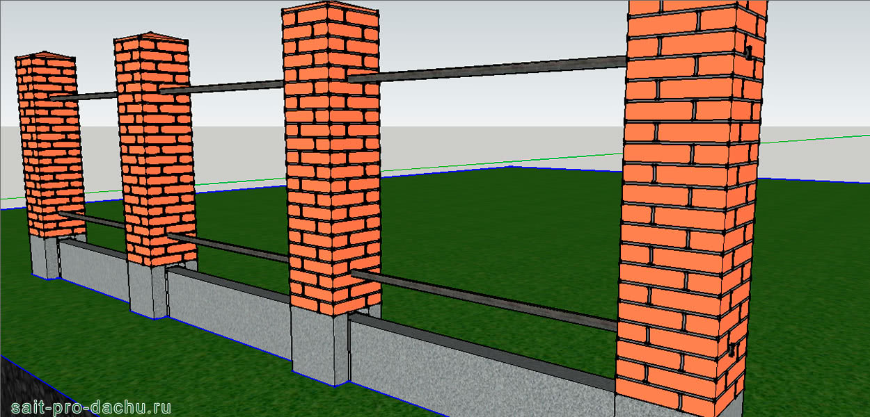 Дальше всё просто. Застилаете фундамент гидроизоляцией и через сантиметровый квадрат выкладываете из кирпича столбики, главное, не забудьте их накрыть козырьками (такие есть в продаже) иначе зиму ограда не переживёт.