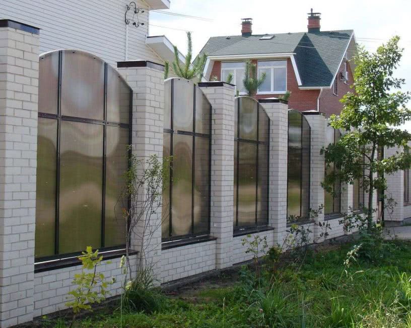 Неплохим решением для вас может стать вариант использования поликарбоната в строительстве изгороди из поликарбоната в сочетании с профилированным металлическим настилом. Существуют схемы и варианты постройки забора из комбинации этих двух материалов.
