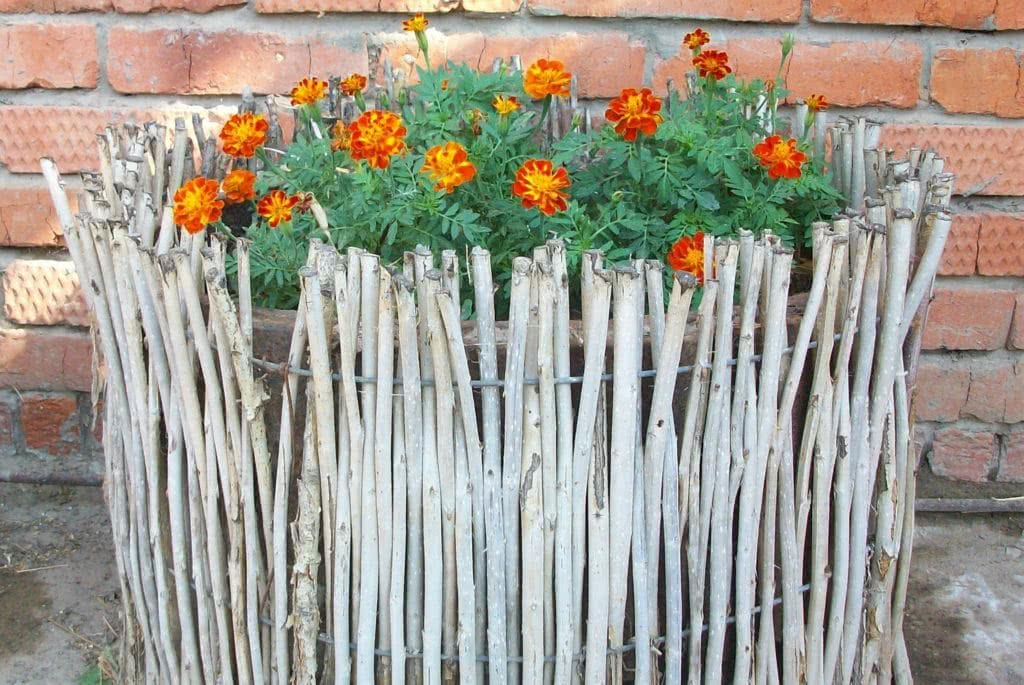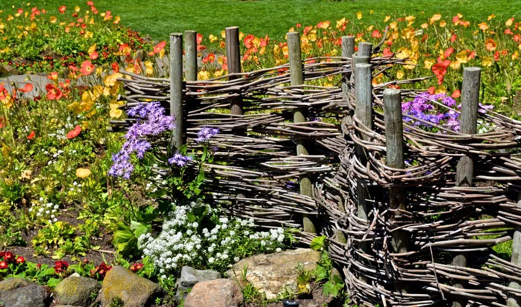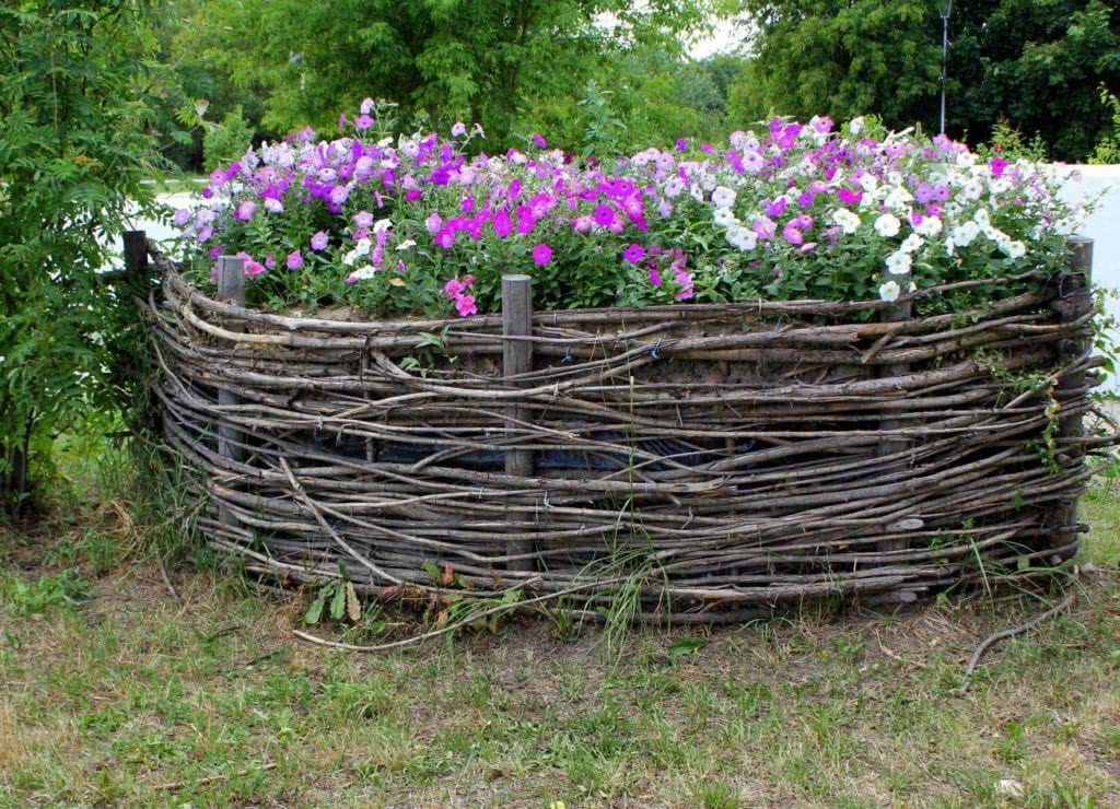 Кстати, можно совместить плетень-забор и основание для клумбы. Такая клумба хороша в местах, где земля малопригодна для выращивания цветов — глина, камни или строительный мусор. Сделайте невысокую стенку из плетня вокруг этой площадки, заполните ее сначала щебнем и песком в случае с глинистыми почвами, а сверху покройте слоем плодородной земли.
