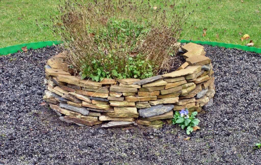 Каменные ограждения для клумб выглядят монументально и основательно, поэтому они отлично подходят для крупных и обширных цветников. Если вы хотите создать высокое обрамление, подготовьте булыжники разных размеров, укладывая их друг на друга с помощью цементного раствора.