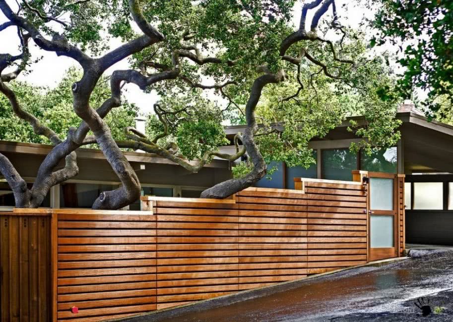 Вопреки расхожему мнению, деревянные заборы гармонично смотрятся не только за городом, но и как способ ограждения городского частного сектора, особенно, если под деревянной изгородью есть каменный, бетонный или кирпичный фундамент.