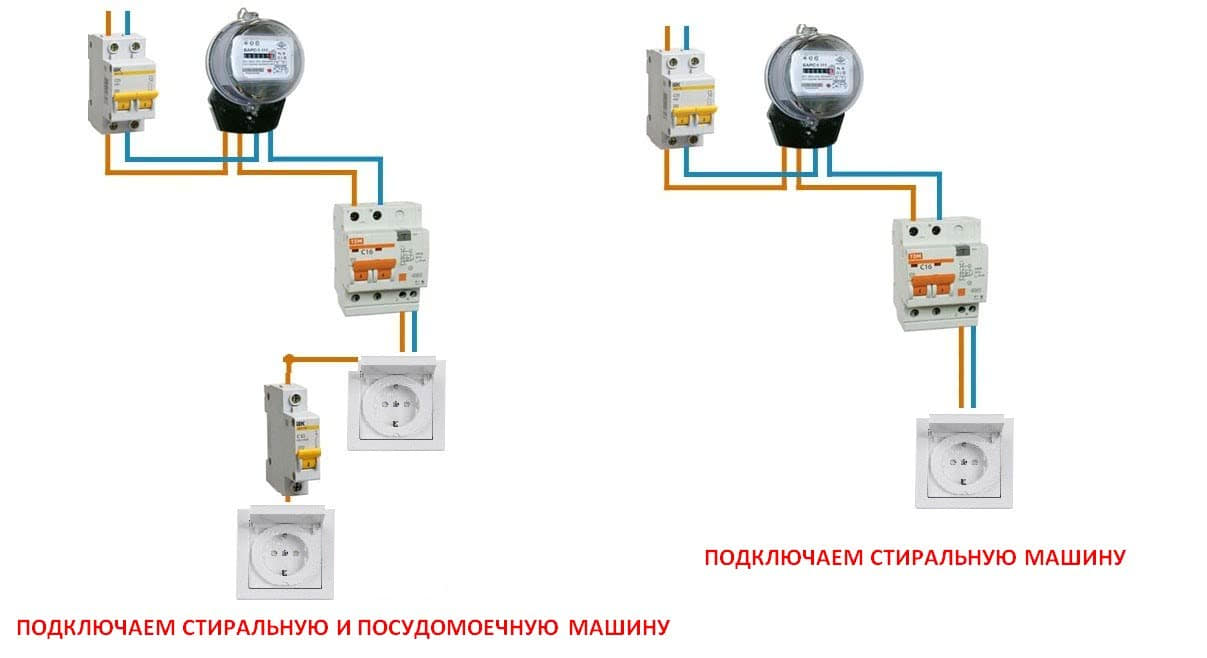 Вот и вся простейшая схема. Если кроме стиральной машины вы хотите подключить к этой цепи и посудомоечную машину, то рекомендуется поставить дополнительное УЗО, как показано на рисунке. В случае отключения этого УЗО, по причине неисправности посудомоечной машины, дифатвомат останется «в строю», а значит, стиральная машина продолжит работу без перебоев.
