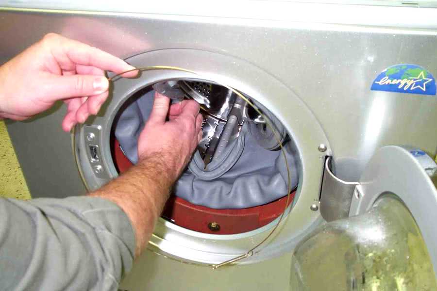 - Установить новую резинку. Это сделать не так легко, как кажется. Материал сложно растянуть вручную, чтобы натянуть на кромку. Для облегчения работы и используют мыльную смазку. После монтажа надо проверить, чтобы уплотнитель плотно прилегал к металлу во всех местах. Если пропустить отслоение в какой-то точке, появится течь в процессе стирки.