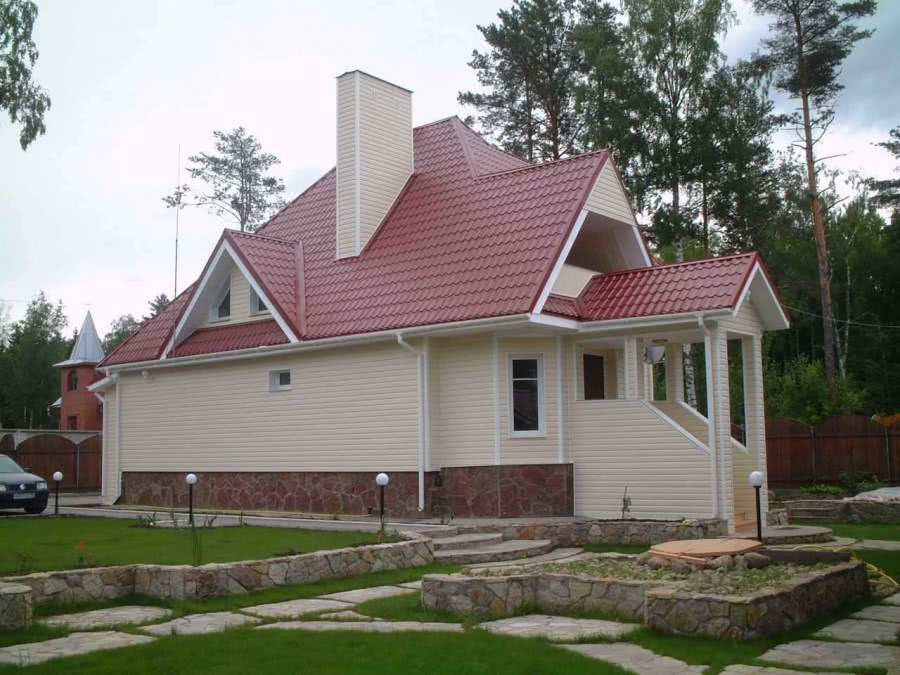 Если в отделке фасада использовались два цвета, то они оба должны сочетаться с кровлей.