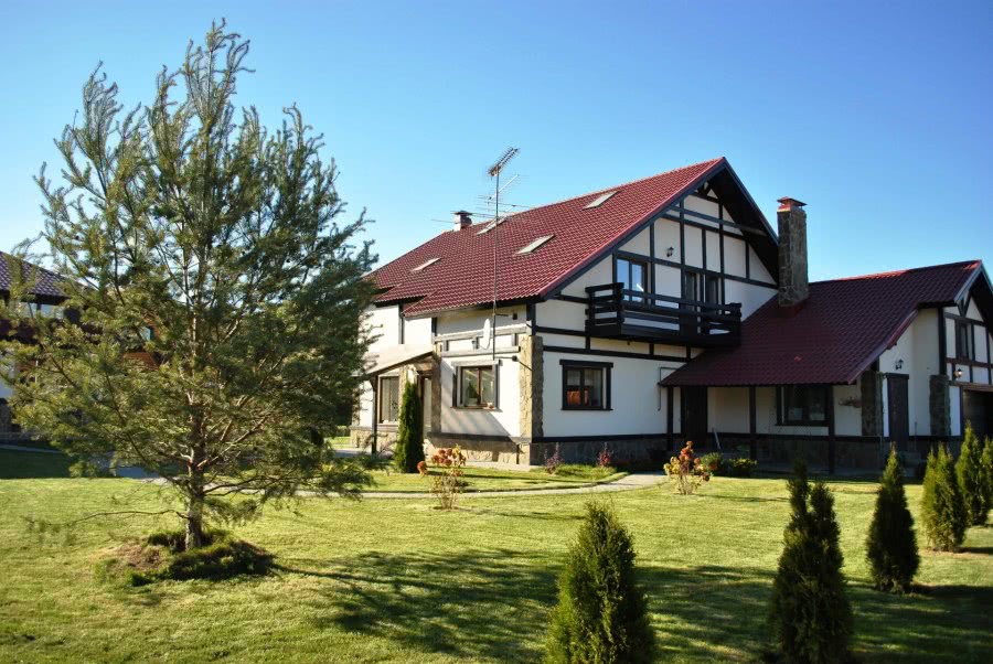 Выбор оттенков одного цвета. Распространенный и практически беспроигрышный вариант. Один цвет разбивается на последовательные оттенки: для крыши, фасадных стен и более мелких деталей. Гармонично смотрятся постройки, выполненные в зеленых, песочных или коричневых тонах, более смело — в красных или синих.